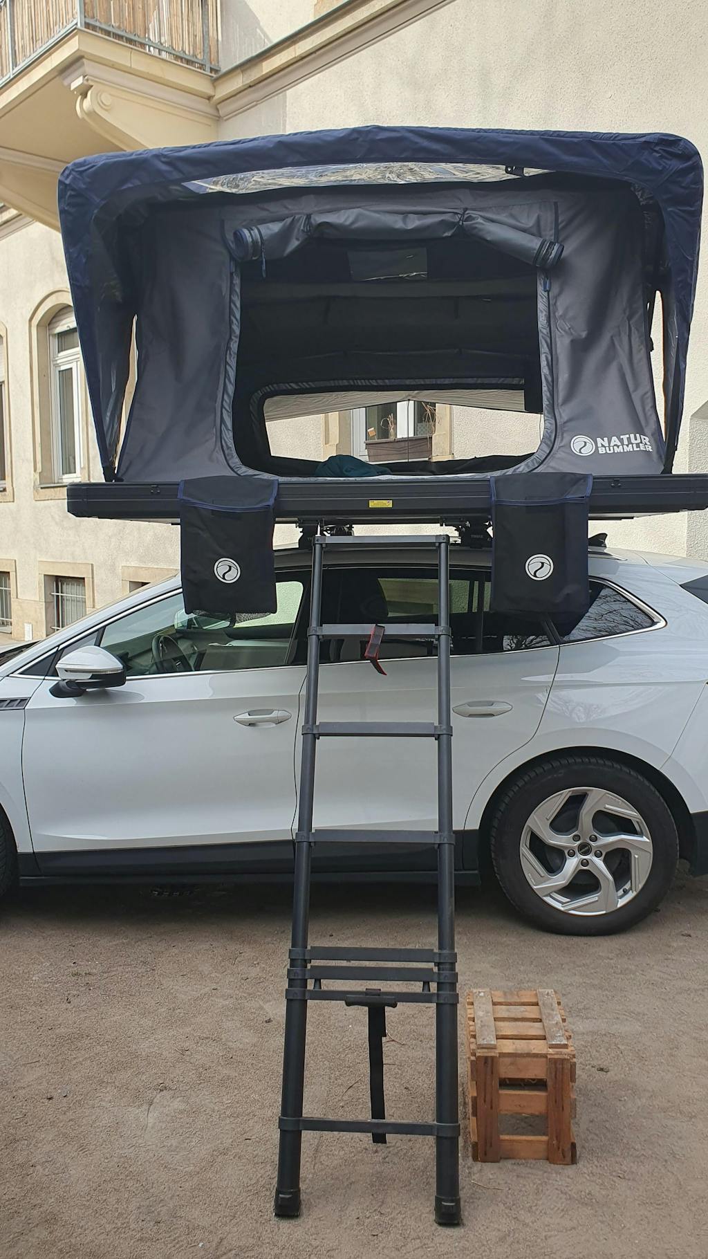 Nachdem sich mein Junior in das Alu-Loft Dachzelt auf einer reisemesse schockverliebt hat und wir es gleich vor Ort erstanden haben, konnten wir es mit den ersten Frühlingsstrahlen endlich ausprobieren. Hat alles bestens funktioniert und es liegt sich so gut, wie auf der Reisemesse. Es hat auch prima auf unseren Thule Dachträger gepasst. Zwei Wünsche hätte ich allerdings noch: "Schreibt nicht in die Bedienungsanleitung, dass man das Loft zu zweit auf das Auto heben kann, das geht bei über 70 kg, auf ein SUV-Dach nur nach längerem Krafttraining. 4 Mann, vier Ecken und das teil ist oben. und die Befestigung an dem Dachträger, insbesondere die Sicherung mit den Kontermuttern bei aufliegenden Loft ist schon etwas fummelig. Da können die Ingenieure noch mal in sich gehen und einen besseren Verschluss, am Besten was nur mit Hebel zudrücken oder so, erfinden. UNd ach ja, für DIY Knallköppe, wie mich dürfte die Aufbauanleitung etwas umfangreicher sein, dann ist die Leiter auch gleich auf Anhier richtig herum angebaut;-)